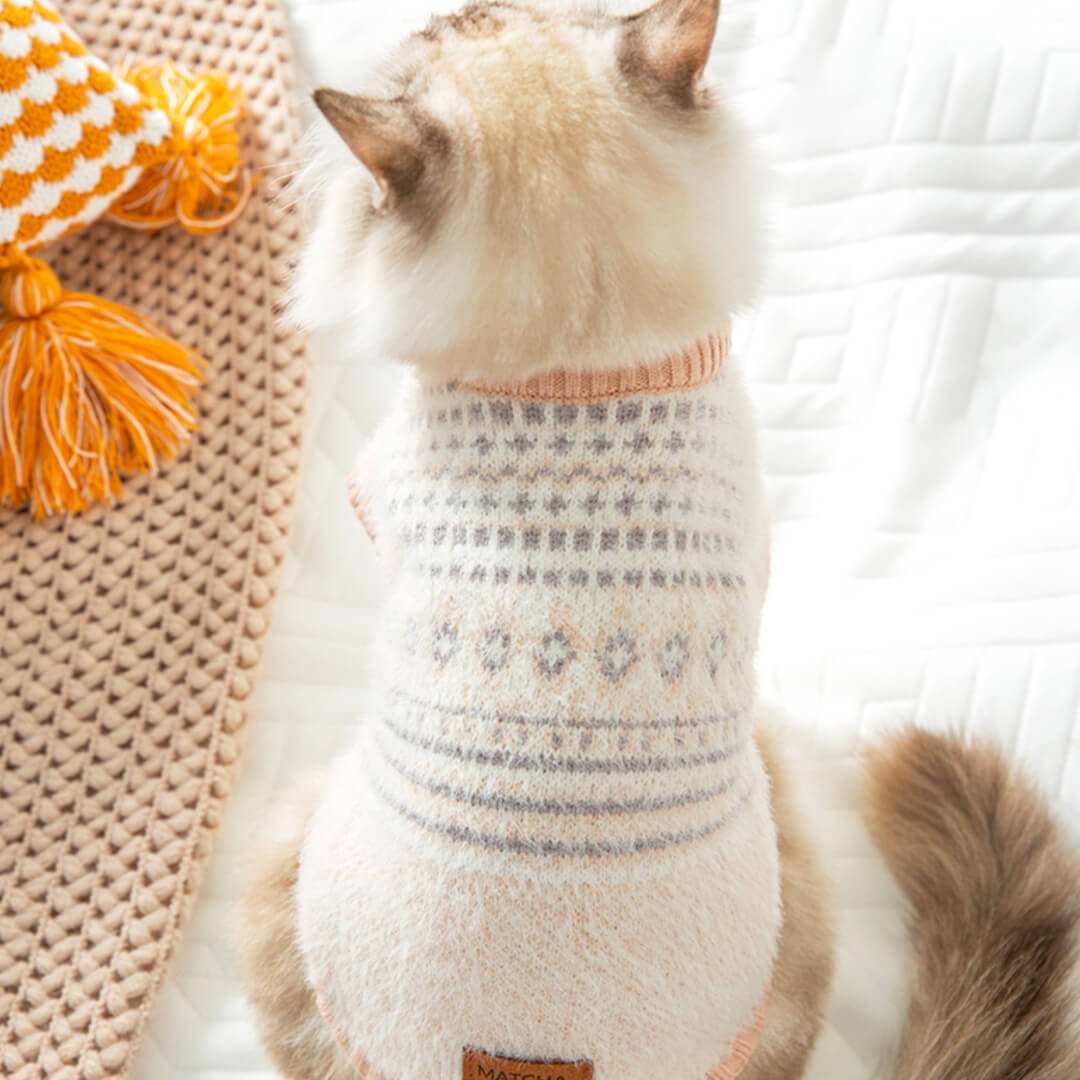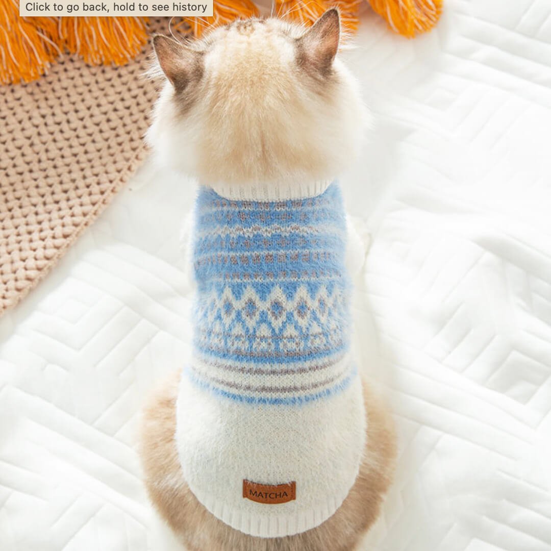 Envelop your beloved fur baby in a realm of comfort and charm with this Fair Isle sweater. Crafted with attention to detail. the fabric’s softness ensures your kitty feels like they’re in a perpetual cuddle.