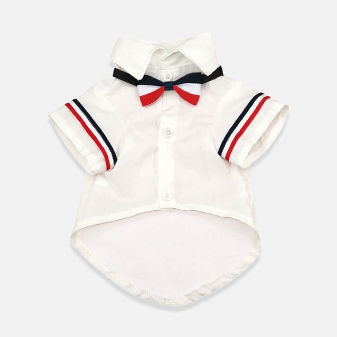 Turn your cat into a proper gentlemeow with this dapper shirt and bow tie. It features chic navy. red. and white trims on the sleeves. purrfectly matched with a coordinating bow tie. This outfit will instantly elevate your kitty’s fashion game. making them the talk of the town. It’s designed for easy on and off. ensuring a hassle-free dressing experience for both you and your feline companion. The soft and breathable fabric guarantees your cat’s comfort. allowing them to move with ease and grace.