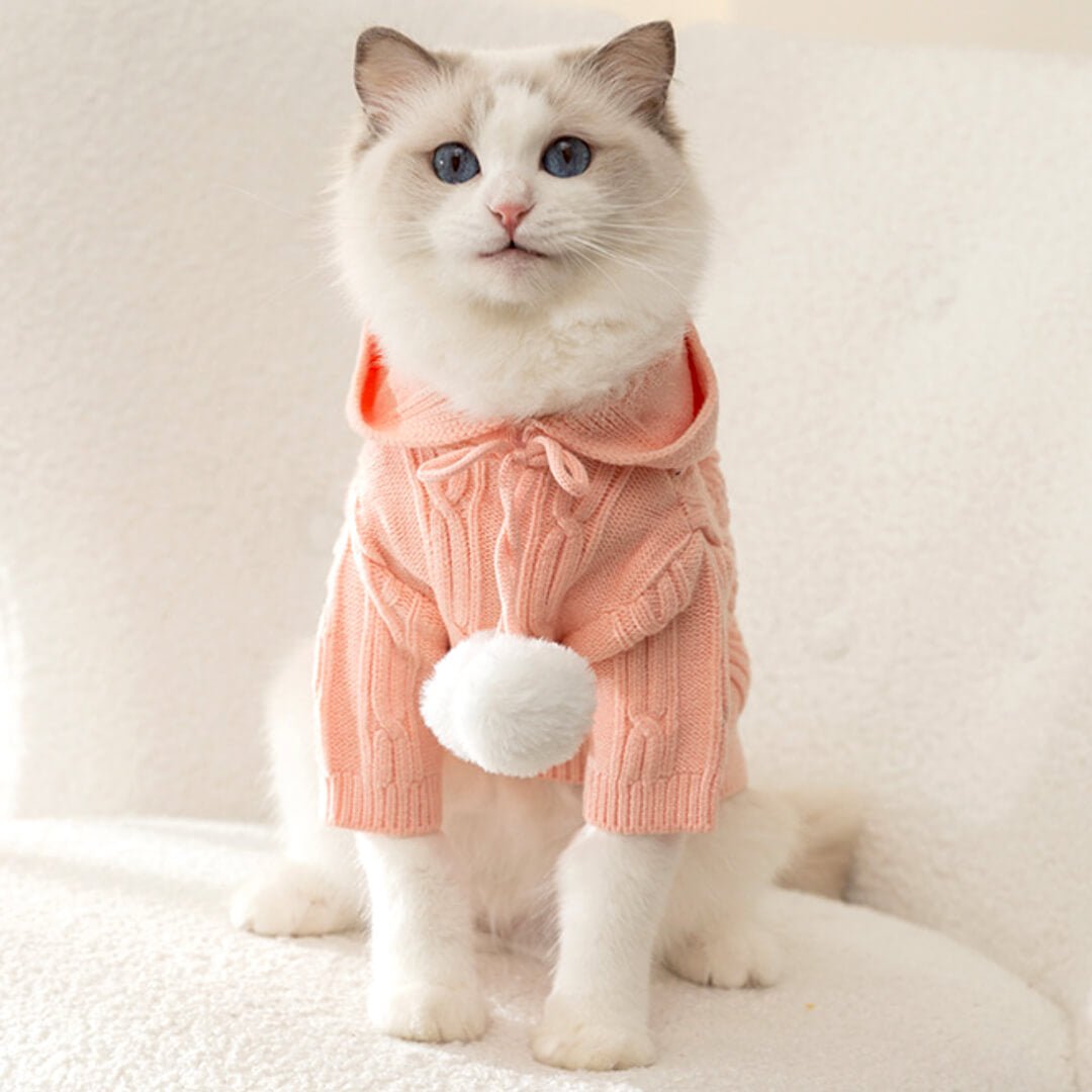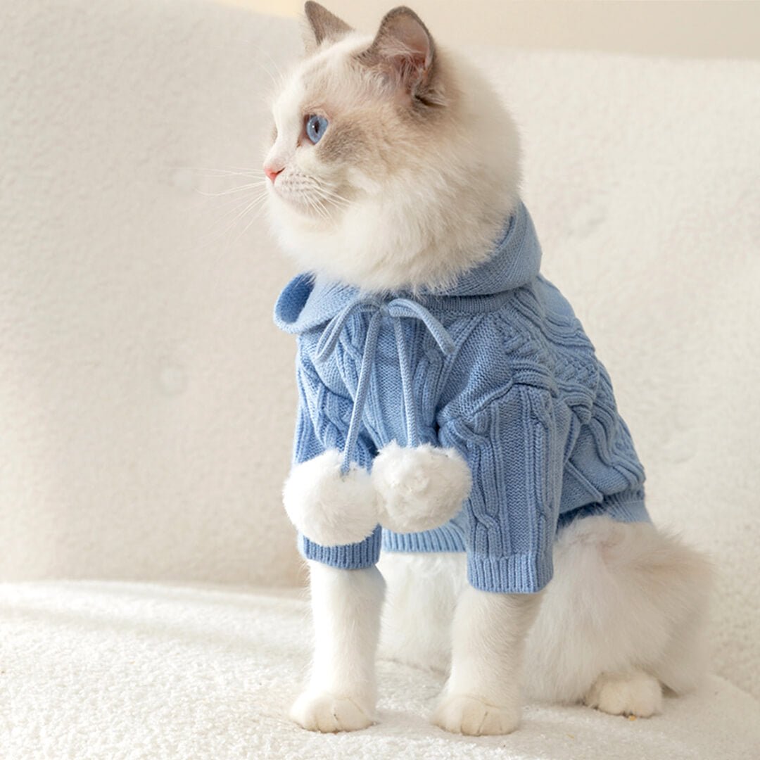 This irresistible hoodie combines comfort and chic like never before. featuring an adorable ribbon adorned with two fluffy white pom-poms. Pamper your stylish kitty and keep them snug with it this winter. Your cat will turn heads in envy-inducing shades of blue. beige. and pink!