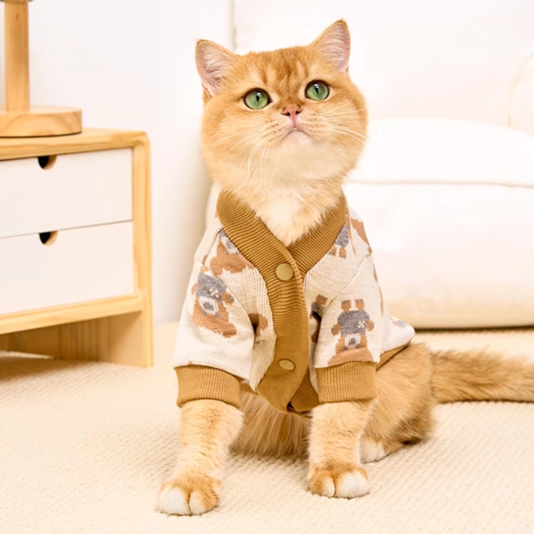 Nothing says adorable like a furball of cuteness wrapped in cozy teddy bear charm! With a cute teddy bear pattern. this cardigan will make your kitty look supurr dapper. Crafted for comfort. the soft fabric ensures your fur baby stays snug and warm. Because every cat deserves a touch of cozy cuteness!
